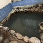 小岩を配置した浴槽は、酸性のナトリウム-硫酸塩泉です。